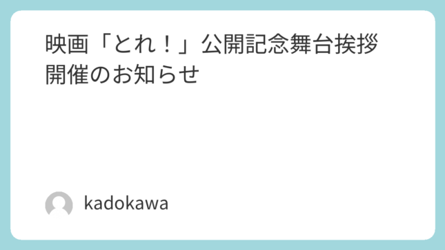 映画「とれ!」の公開を記念しまして、東京、大阪、名古屋での公開記念トークショーの開催が決定いたしました。東京は、コウイチ監督と“生粋のウィキラー”であるホラー作家・くるむあくむさんをお招きしてのトークショー、大阪と名古屋は、コウイチ監督登壇...